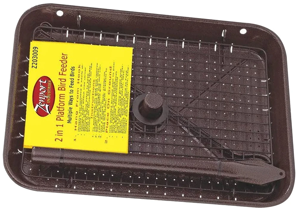The Zenport Z203009 2-in-1 platform bird feeder provides multiple ways to feed birds. Open design allows for viewing birds from most angles. Mount to bird feeder pole or hang from a hook. Mount with ground post for feeding squirrels, critters and ground feeding birds. Durable, metal construction with weather resistant finish. Removable grid keeps larger birds from throwing seed on the ground, remove the grid when feeding squirrels and critters