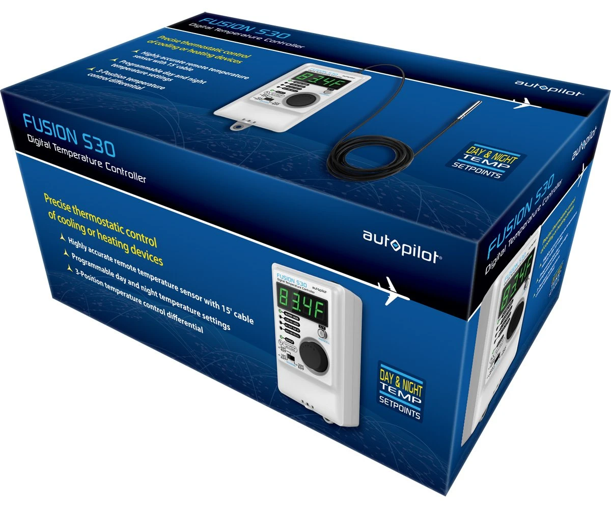 The Autopilot FUSION S30 Digital Temperature Controller can be used with equal effectiveness as a cooling or heating thermostatic controller. Select Cooling Mode or Heating Mode with a simple click and turn of the unit’s dial, then adjust the controller to enter the preferred temperature setting. Once a device is plugged into the controller, the FUSION F30 will take complete control of the device and operate off the programmed settings.