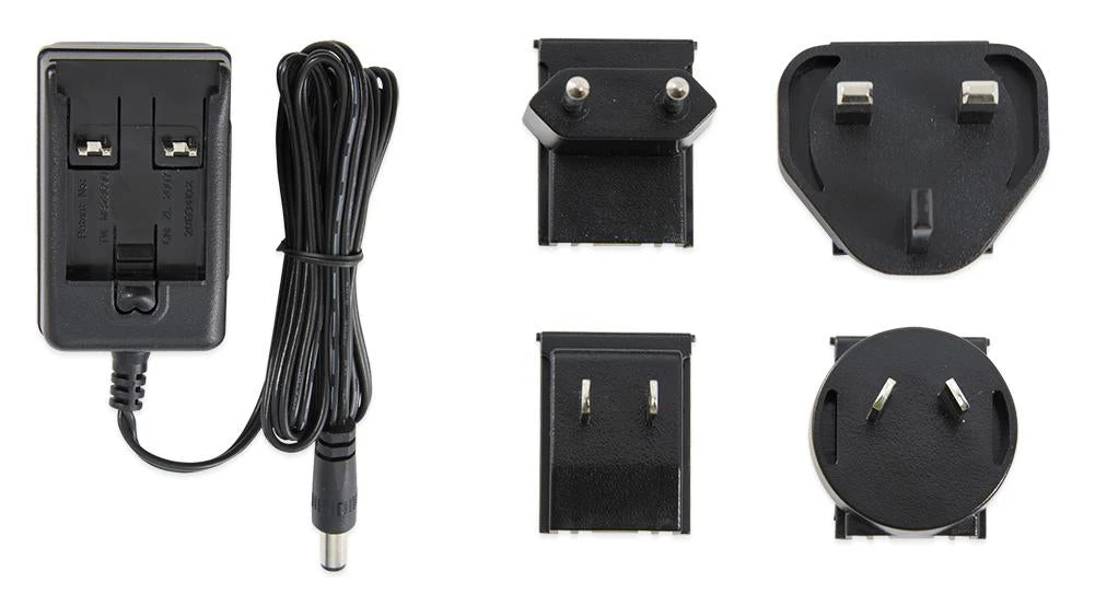 Power supply unit with international plug adapters for North America, Australia/New Zealand, UK and Europe.