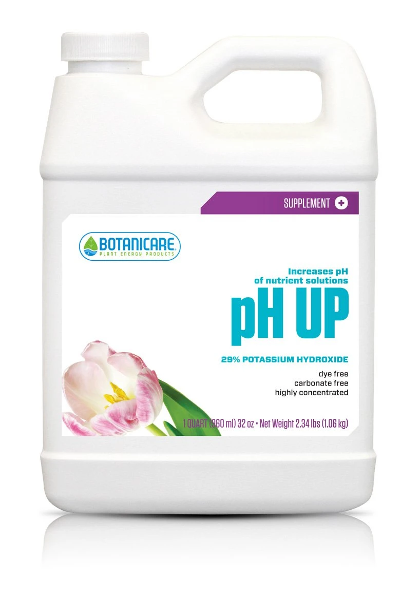 Botanicare’s pH Up consists of a 29% concentrated potassium hydroxide solution that has an extremely low level of phytotoxicity and does not contain salts or chlorides.