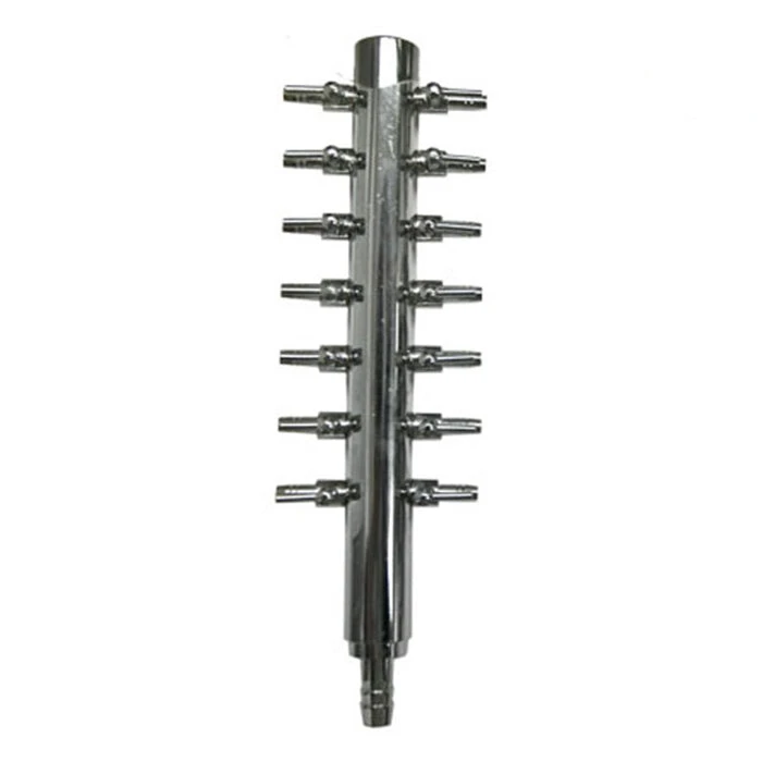These chrome air dividers feature individual valves to control each outlet and have an inlet which accepts 3/8″ inner diameter hosing.