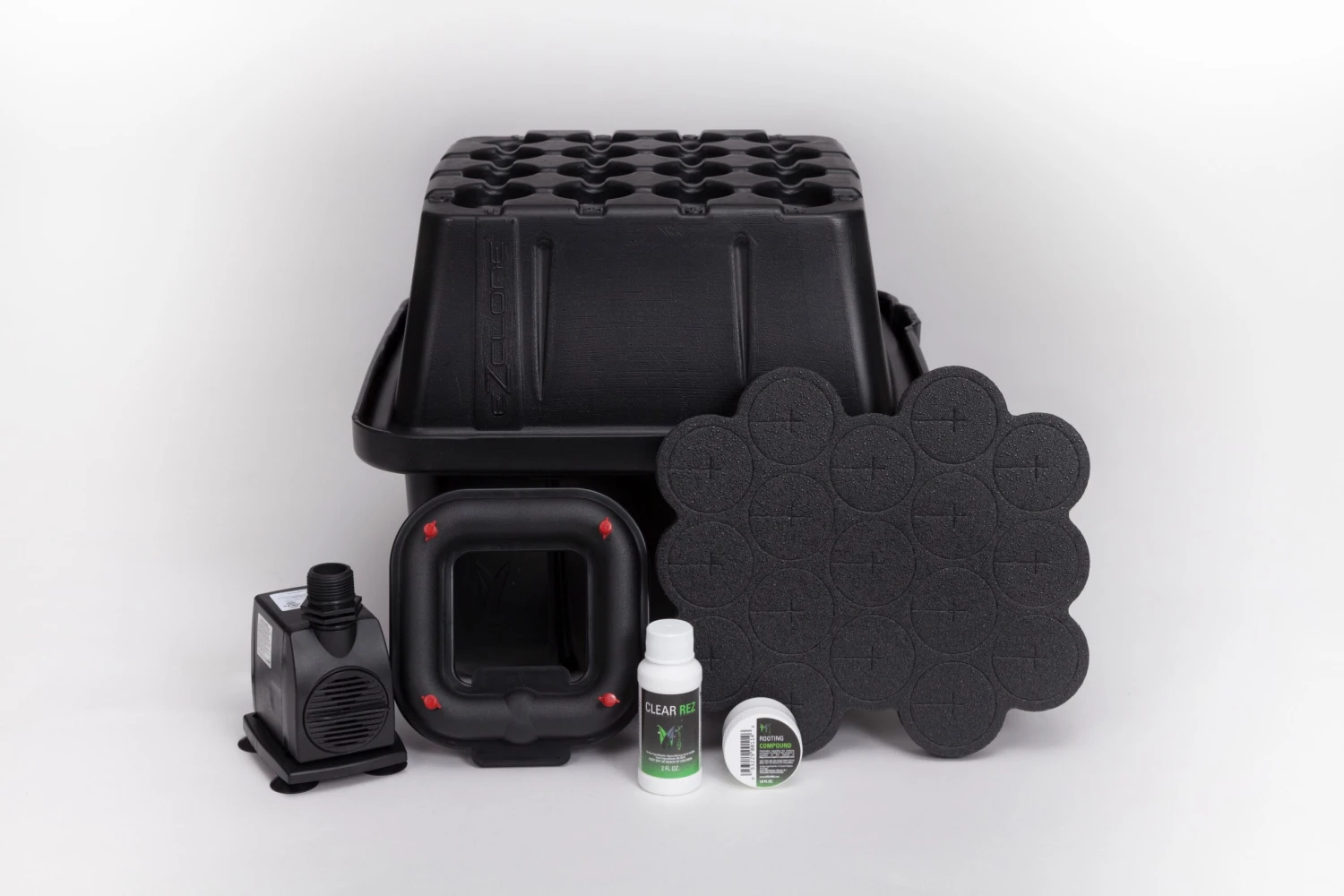 EZ-CLONE is proud to introduce the brand new 16 and 32 Site Low Pro Systems. The overall height has been reduced, while increasing the structural integrity of the new proprietary Lid and Reservoir. It is manufactured from durable UV protected HDPE plastic. The Lid has alpha numeric symbols formed directly into the plastic, which allows simple identification of multiple strains of cuttings, and comes with four way finger slots for improved Cloning Collar extraction. The Reservoir has an increased lip height, with an extended flange and drainage gutters, to ensure a leakproof design. These smaller Systems utilize the same great Aeroponic Misting Technology as all of our larger systems. It’s perfect for cloning a variety of plants in small areas.