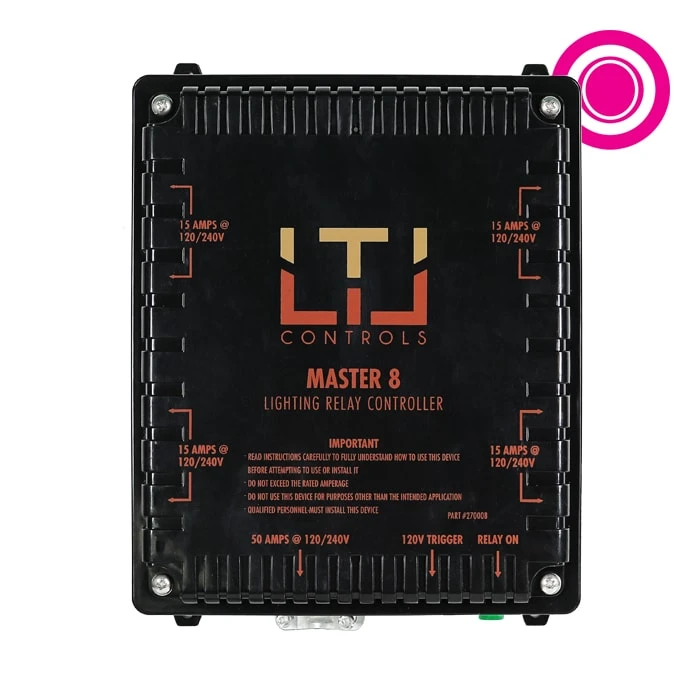 The Master 8 by LTL Controls is the safest and easiest way to control an 8 HID lighting setup. This controller has the capability to run a maximum of (8) 1000W ballasts using 120V power, with a maximum relay amperage of 50 amps, and includes a 120V trigger cable which can be connected to a 120V timing device.
