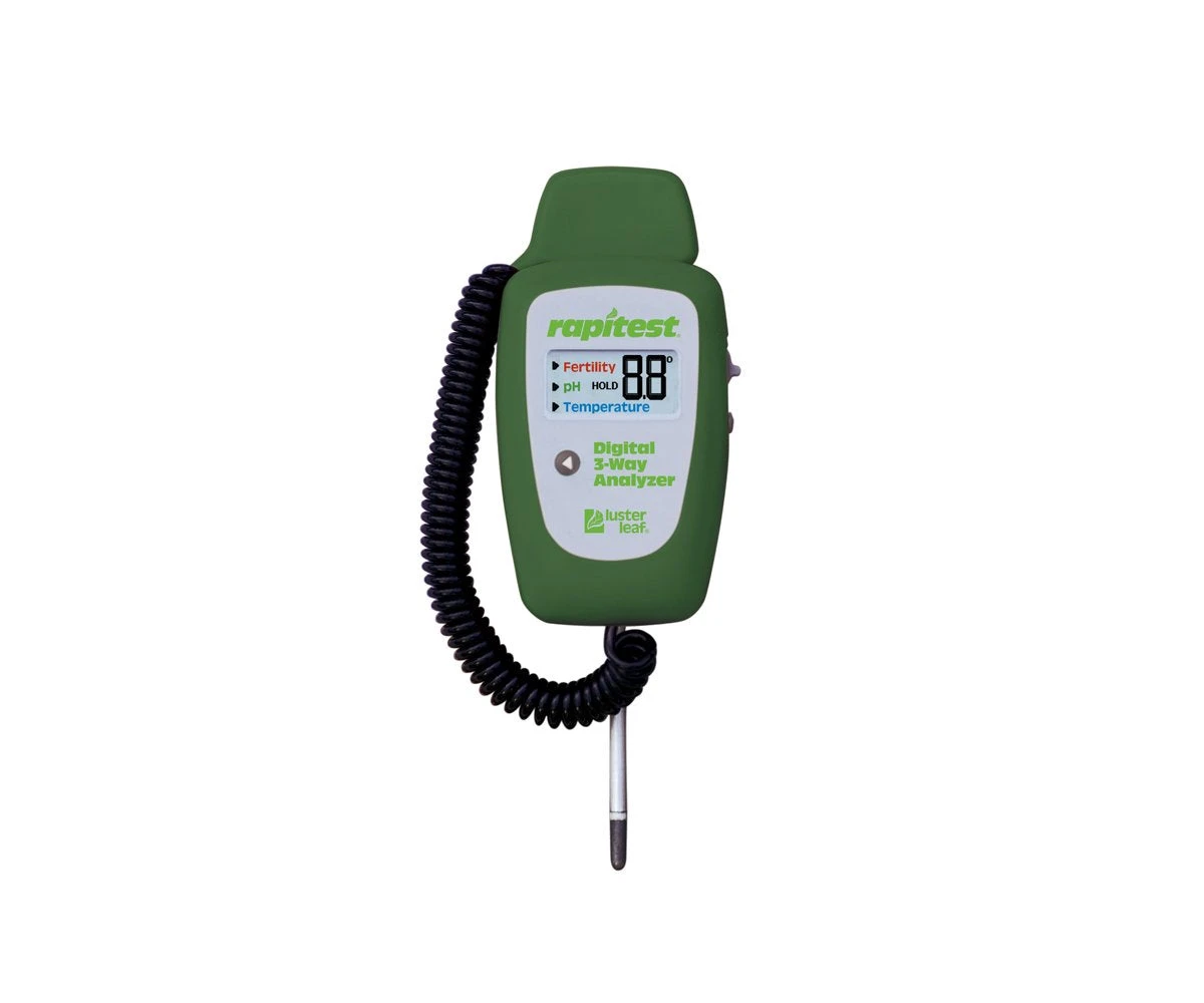 Digital device for determining soil pH, soil temperature and soil fertility.