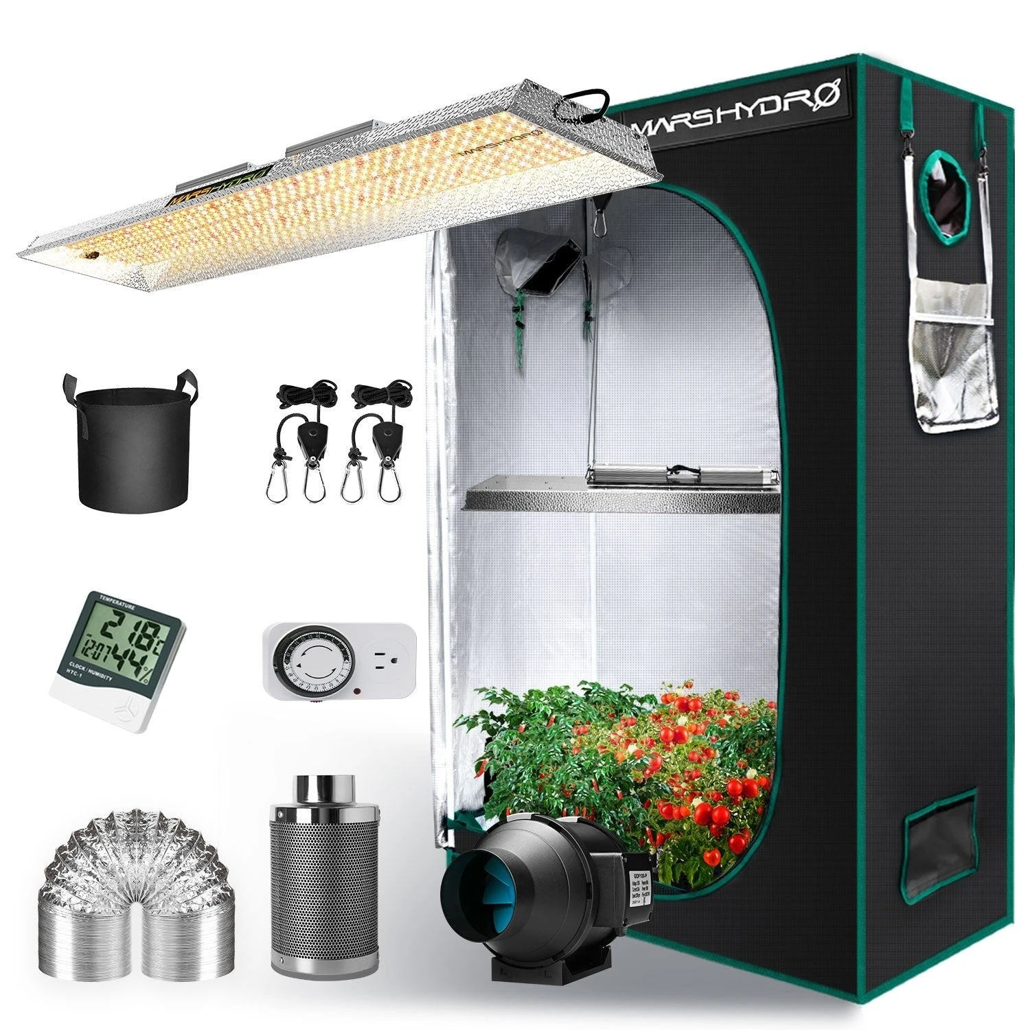 1x 4 Inch Inline Fan with Fan controller, 1x Carbon Air Filter, 1x Timer, 1x Thermos-hygrometer, 2x yoyo hangers, 2x Steel Clamps for Ventilation Kit 6x 5 Gal Grow Bags