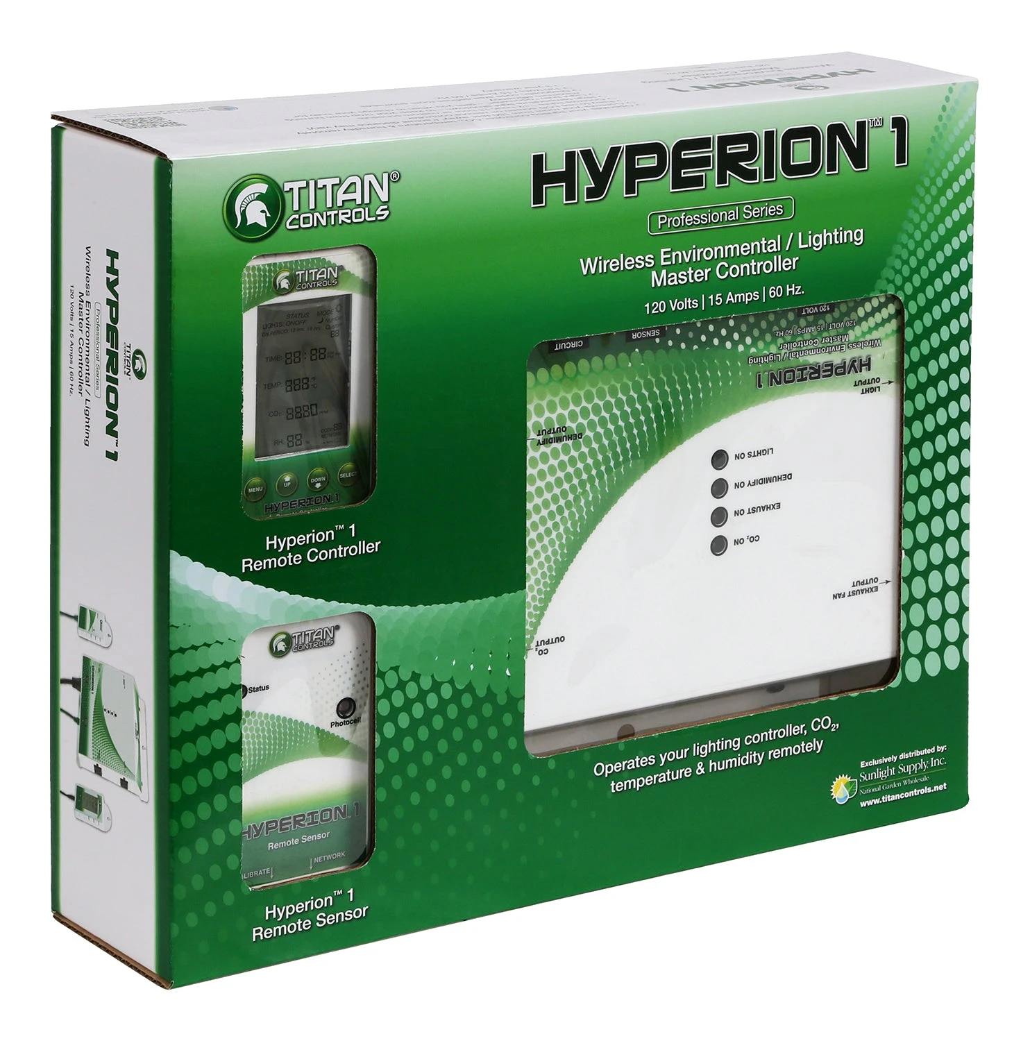 Complete control of your grow room from up to 150 ft away without wires, the Hyperion 1 Wireless/Environmental/Lighting controller is the solution! Monitor and control the CO2, temperature and humidity during the day night periods. Then add a fully functional lighting controller (via trigger cordsets) that includes a high temp shut-off, 15 min cool down with preset and custom lighting schedules. It even tells you when to change your grow bulb. 15 Amps maximum/120 V / 60 Hz. US Patent No. D660,252.