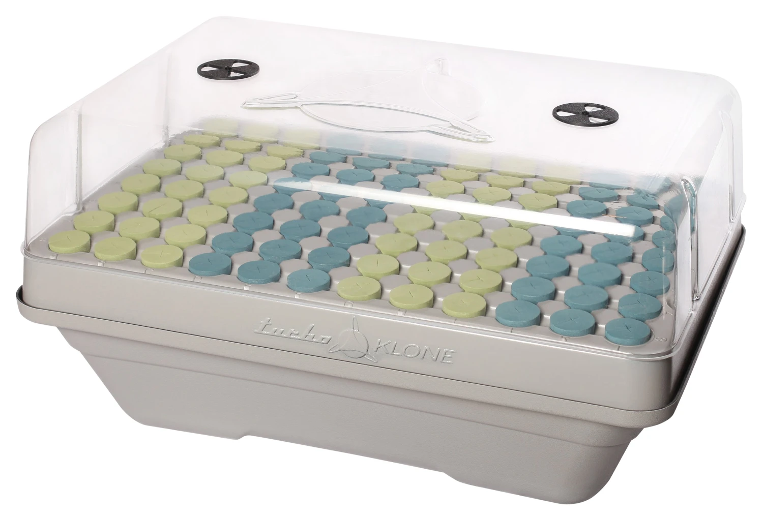 The 96 site Elite Klone Machine is a Commercial Level propagation system. These systems are specifically designed for serious growers. Made of grey ABS plastic shell for less heat absorption from lights above and greater reflective properties to promote efficient growth. Has alpha/numeric lid to categorize different plant species with ease as well as colored Klone collars to visually differentiate plant species using a color coded pattern determined by you. Larger fan to introduce more oxygen to the grow chamber with even greater cooling effects. Optional humidity dome with integrated vents allow you to adjust the humidity level within the dome and provide more control.