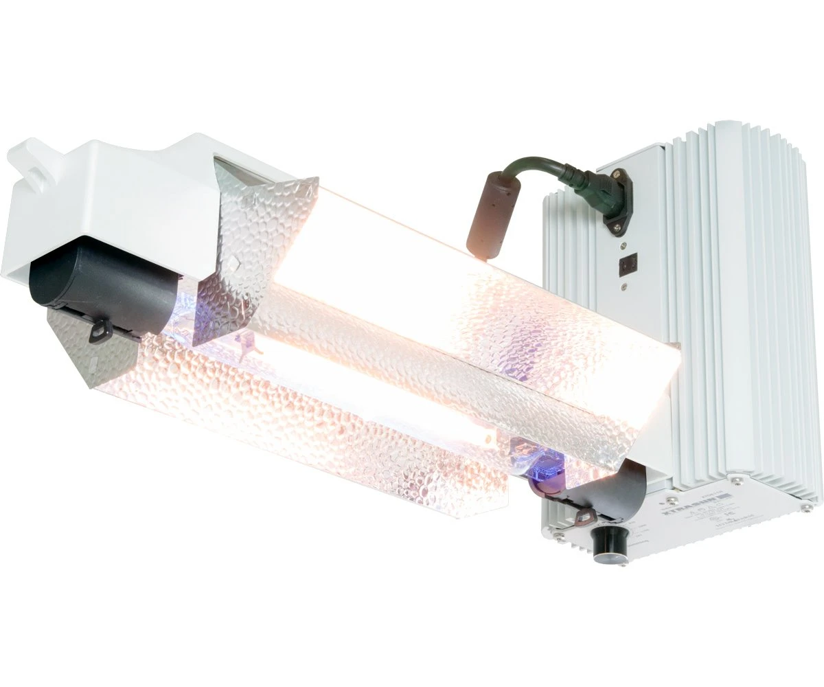 The attached, open-form reflector is made from multifaceted 95% reflective European hammertone aluminum and delivers uniform growth over a broad footprint. The louvered top effectively dissipates heat while operating DE bulbs at ideal temperatures for maximum light output and lamp life.